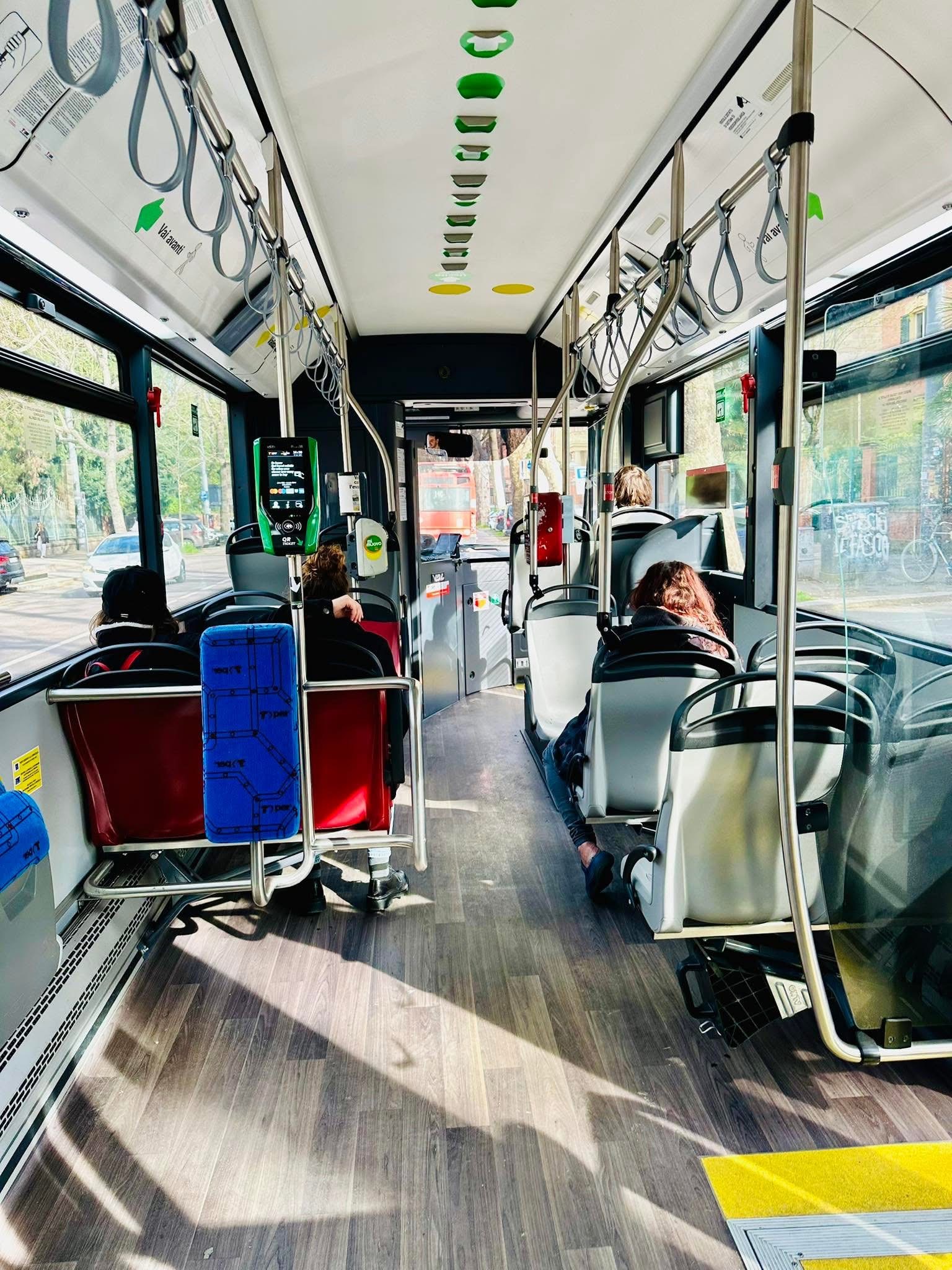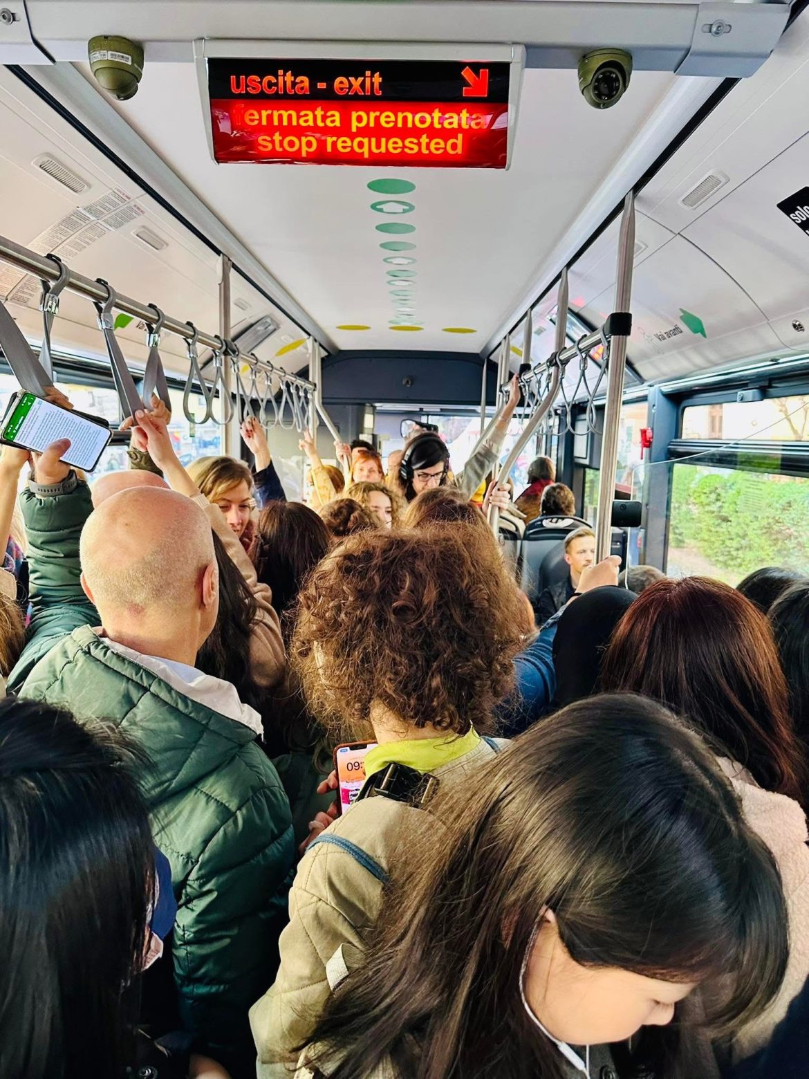擠公車實在是場挑戰,扛著大背包(裡面都是各種目錄摺頁樣書)重得要命,還得隨時提防小偷,但其他同業朋友也分享了溫暖的故事,她們說一位義大利奶奶笑盈盈地照顧車上乘客,讓大家放包包在她位子,下車時還高聲祝福大家書展順利,使得全車苦著臉的人瞬間露出微笑。