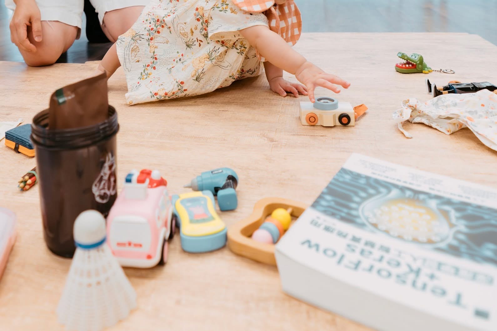 在托嬰中心,她抓了書本、算盤和麥克風;家裡的玩具,她抓了雞腿、耙沙鏟和彼得兔玩偶;朋友們帶來的東西裡,她又抓了相機、鱷魚牙齒玩具、手機、算盤,還有一本超級厚重的《TensorFlow+Keras 深度學習人工智慧實務應用》,那本像磚頭一樣的書,她竟然能用雙手抓起來,全場笑翻 🤣