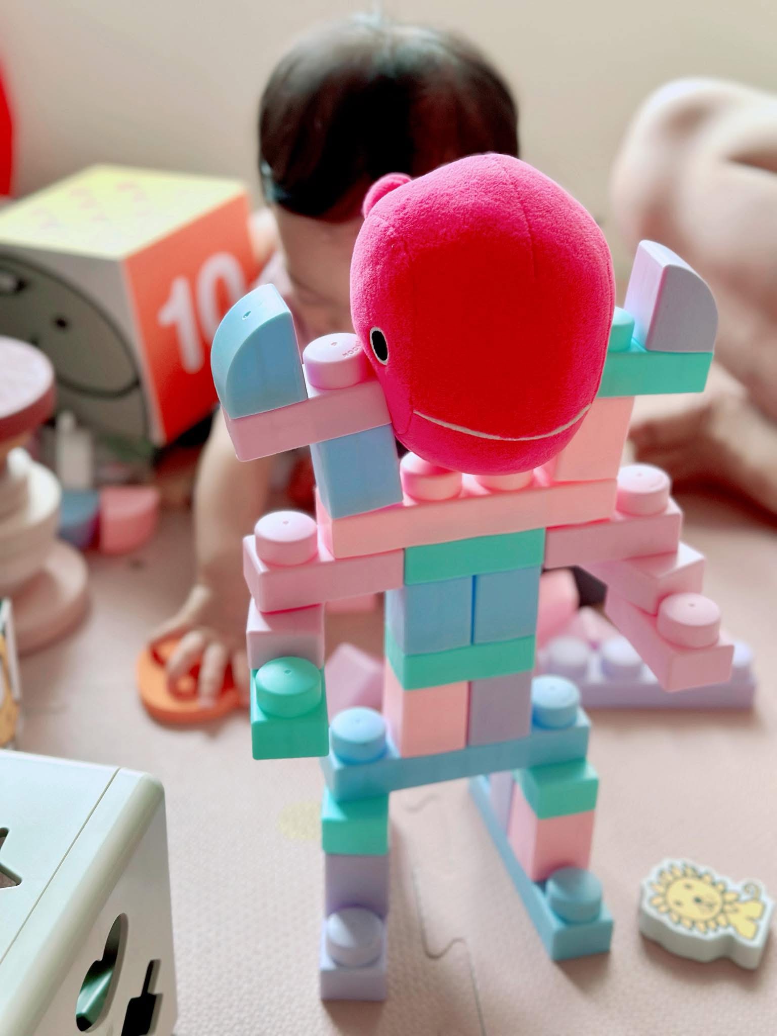 爸爸還用積木做過十字弓、飛機、石中劍、步槍、手槍、盆栽、城堡、高塔、水壩⋯⋯40 個配件可以玩成這樣,真心佩服,是不是該拍起來做成作品集😆